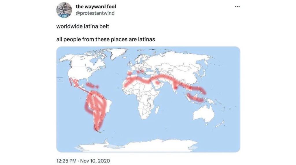 “Brown-ness” is a term I have been thinking about a lot since the super bowl Sunday halftime show. There is so much more that connects “brown people” across the states than just being minorities in this country (a term I vehemently despise). From the child sleeping on chairs, to the cookie tin filled with sewing needles and thread, we as a “collective” of brown identifying bodies share so much in common but so many of us struggle to mend broken connections or look at each other as reflections rather than lesser versions. In the south asian communities I have often seen, specially older generations, harbor racist ideologies towards other ethnicities who more or less look just like them but there is always some sort of flaw. “They’re too dark”, “they’re indecent”, “no sense of civility”. I couldn’t help but think if those people would think the same things right back at us. Except both parties are saying all this while sitting in plastic white chairs, surrounded by loud music, having tea, and discussing it all over some meal that definitely involves rice. The great starchy cultural connector. On the completely innocuous app, Twitter, currently known as *redacted, this image of something called “The Latina Belt” has resurfaced since Sunday. It is an image that highlights all the countries that “are Latina” and includes North Africa, Pakistan, India, the Philippines and others. It is a funny tweet for sure but also a beautiful image that speaks to this connectivity brown people share across the world.